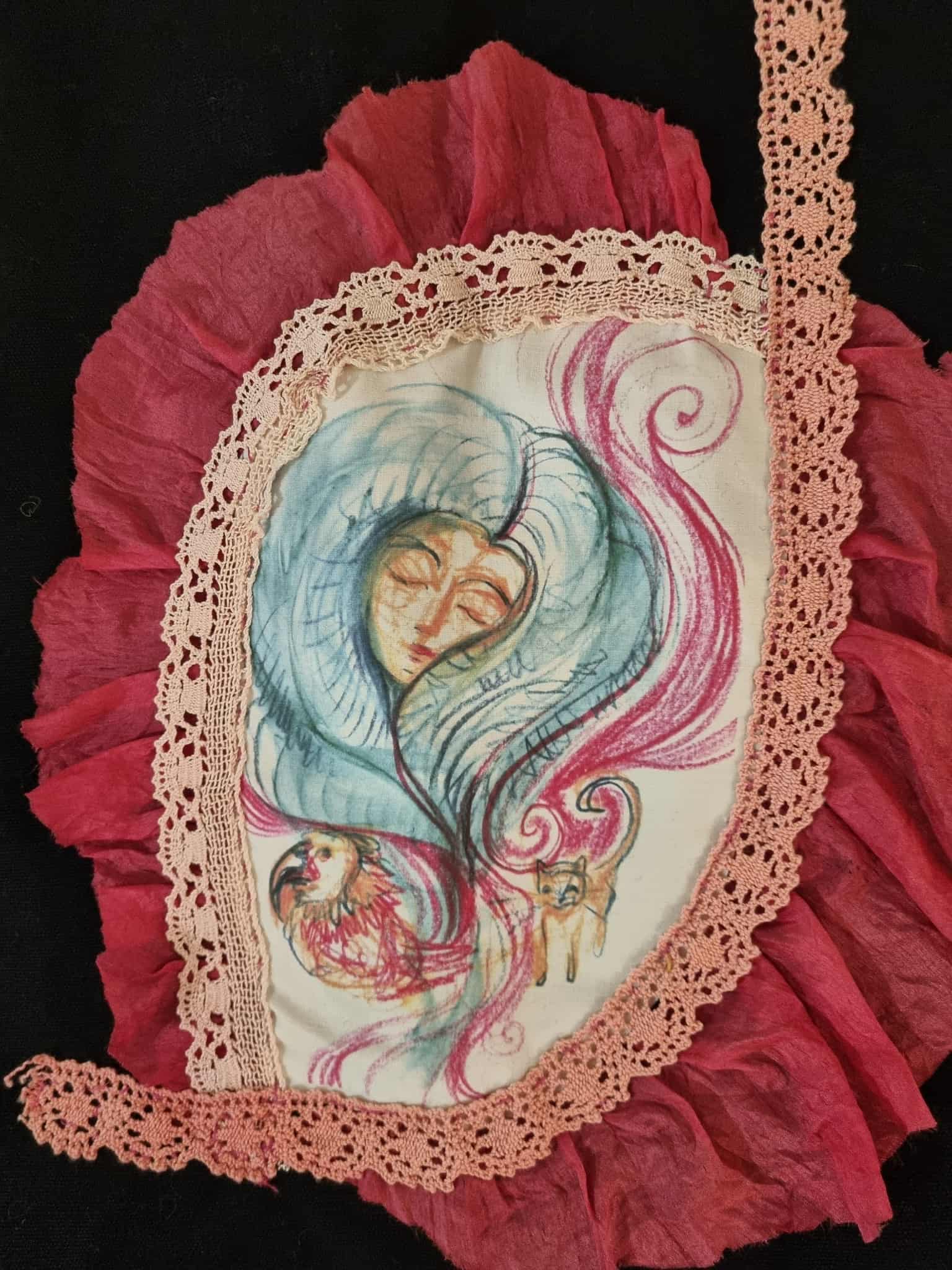 Celková koncepce tašky je velmi netradiční, obrázek je ručně obšitý růžovým hedvábím a bavlněnou krajkou.