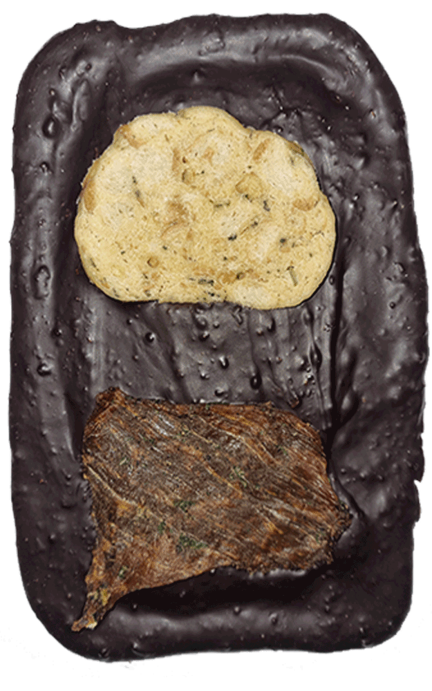 Složení: 70% hořká čokoláda (kakaová hmota, cukr, kakaový prášek se sníženým obsahem tuku, kakaové máslo, emulgátor (sojový lecitin, polyglycerol-polyricín-oleát), vanilkový extrakt BOURBON MADAGASCAR) (93 %), sušená mletá cibulka, smažená cibulka v těstíčku (palmový olej, pšeničná mouka, sůl), karlovarský knedlík (pšeničná mouka, pitná voda/mléko, kostičky pečiva (pšeničná mouka, voda, droždí, cukr, sůl), vejce/vaječná melanž, jedlá sůl, kypřicí prášek (hydrogenuhličitan sodný a dihydrogen fosforečnan sodný), pažitka, petrželová nať, muškátový květ a pepř), jerky (vepřové maso sušené, sojová omáčka (sójové boby, pšenice, voda, sůl), sůl, pepř, drcený česnek, medvědí česnek). Může obsahovat stopy arašídů, sóji, skořápkových plodů a sezamu.