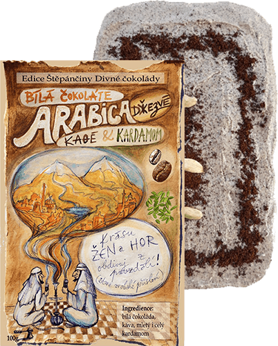 Složení: Bílá čokoláda (cukr, kakaové máslo, sušené plnotučné mléko, sušená syrovátka, laktóza, emulgátor (sojový lecitin, polyglycerol-polyricin-oleát), vanilkový extrakt BOURBON MADAGASCAR), mletá káva 7 %, sušený mletý kardamom 1,5 %, celé tobolky kardamomu 0,5 %.